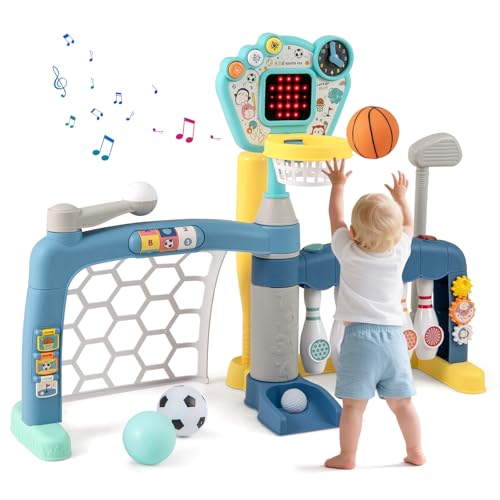 FANTASK basketkorg barn, 5-i-1 sportstativ med fotbollsmål golf bowling baseball, multisport lekset med ljus ljud för småbarn inomhus utomhus