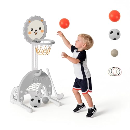 hoopyosms 4-i-1 basketkorg för barn, justerbar höjd med fotbollsport, kastar ringar och golf, minikorg inomhus och utomhus, multifunktionell sportleksak för barn, grå