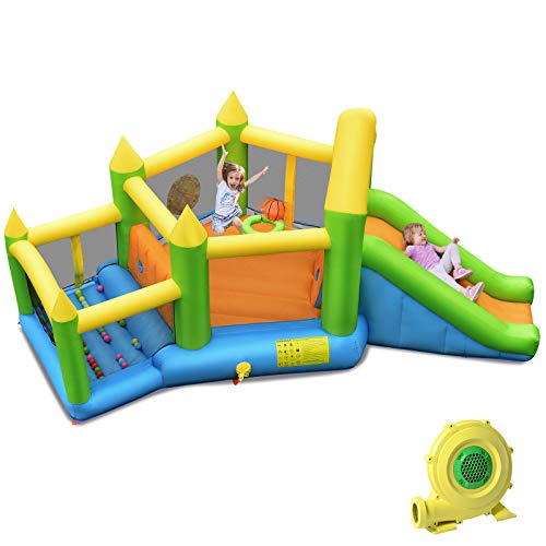 GOPLUS Uppblåsbart hoppborg, hopplås med rutschkana, hoppområde, klättervägg, basketkorg & målspel, Springburg från 3–10 år för inomhus och utomhus (polygon, med fläkt)
