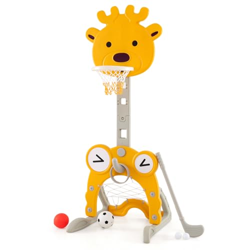 FantASK 4-i-1 barnbasketkorg-set, höjdjusterbart basketstativ och fotbollsmål & ringkast & golf, basketspel för barn från 3 år (gul)
