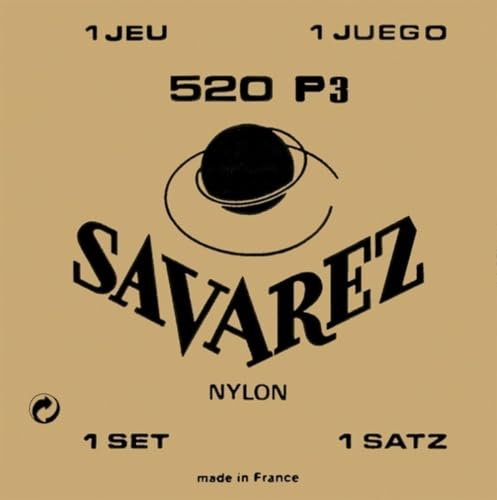 Savarez strängar för klassisk gitarr, set Traditional Concert 520P3 Normal Spänning, G3 med nylonkärna och plastomspinning, bassträngar silverbelagda, rött "kort", Made in Europe