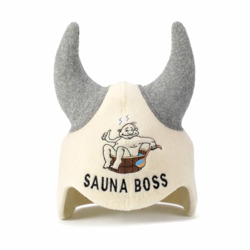 Natural Textile Bastumössa “Sauna Boss Devil” Vit - Bastuhatt 100% ekologiska ullfiltmössor för rysk Banya - Skydda ditt huvud från värme – Bastuguide-eBok på engelska ingår - med broderi