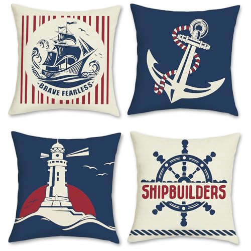 COZZSNUGE sommar nautisk kuddfodral 45 x 45 cm, båt ankare kontroll fyr röd marinblå dekorativt kuddfodral prydnadskudde för soffa vardagsrum hem set om 4