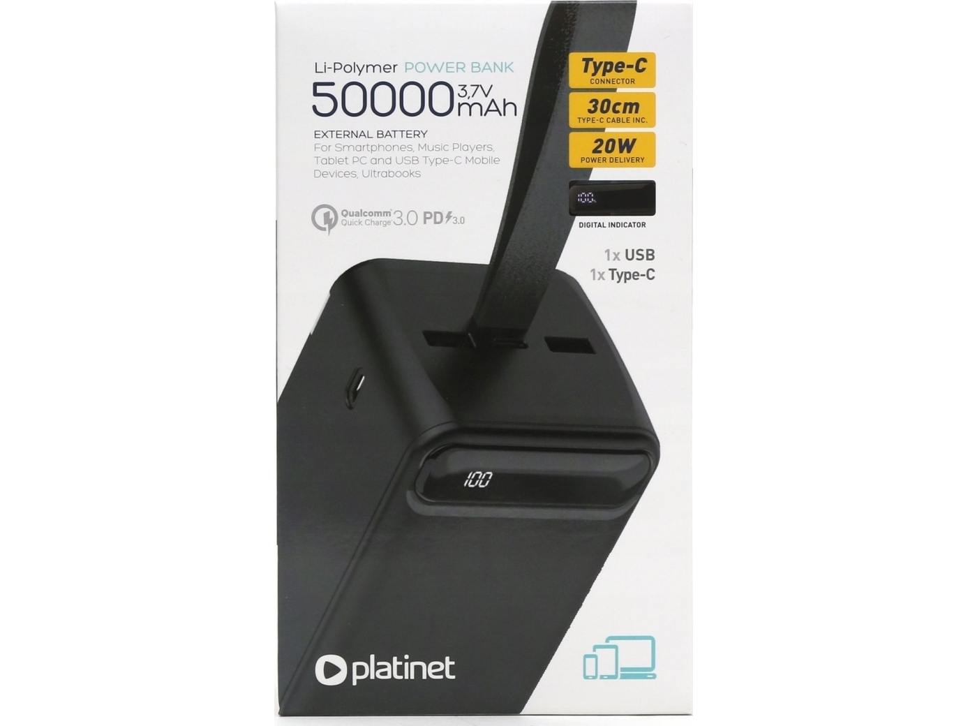 Externt Batteri Power Bank Platinet 50000Mah (1Xusb 1Xtyp-C Qc3.0 20W) Svart