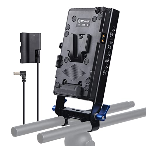 Moman V-Mount Battery Plate VLock adapterplatta, nätdelsfördelare med 15 mm stångklämma för BMPCC 4K/6K kamera Canon Sony, 5V/8V/12V/15V DC/D-Tap-utgång/USB-port med LP-E6 Dummy-batteri och DC-kabel