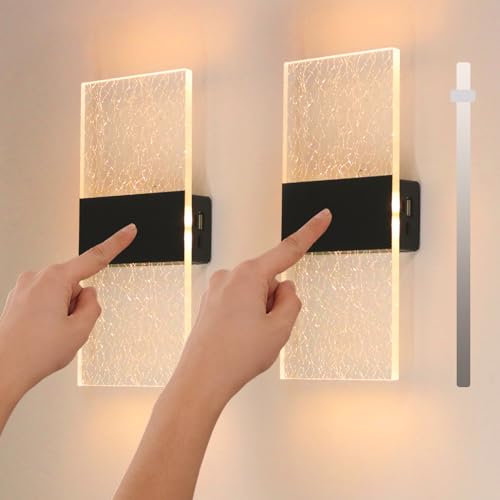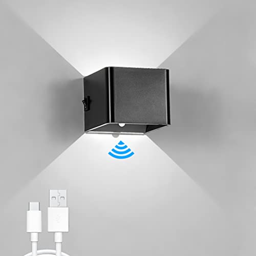 WRMING LED-vägglampa med batteri, trådlös med rörelsedetektor, 5 W, inomhusvägglampa, strömbrytare, trappljus, USB, uppladdningsbar varmvit, batteridriven, magnetisk upp- och ner-ljus, hallampa (svart 2 st)