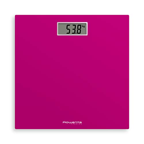 Rowenta Premiss 2 Digital personvåg, härdat glas, noggrannhetsgrad varje 100g, smarta funktioner, stor display, inklusive batteri, Fuchsia, 30 x 30 cm
