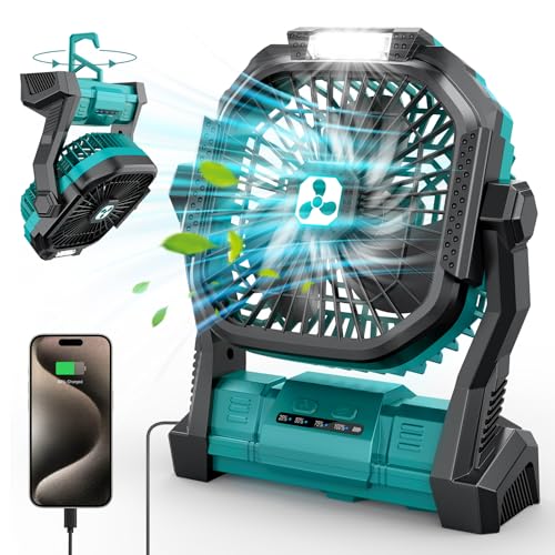 KITWLEMEN Bärbar campingfläkt med LED-lykta - 40 timmars drift Laddningsbar batteridriven fläkt med krok för upphängning för tält, bil, husbil, orkan