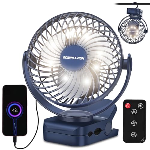 GOBRILLFUN Batteridriven clip-fläkt med fjärrkontroll, 9 LED-lampor, 6-tums USB-uppladdningsbar fläkt med 3 hastigheter, bärbar personlig för hem, kontor, husbil, camping utomhus (Blå)