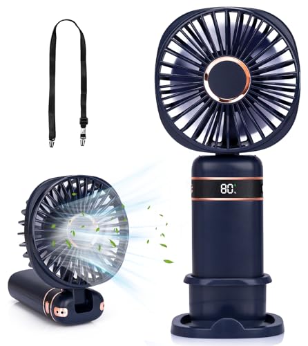 Koonie Bärbar handhållen fläkt, batteridriven fläkt med bas, 8 timmar, digital skärm, 5 hastigheter, 90° justerbar, uppladdningsbar minifläkt för utomhus inomhus (mörkblå)