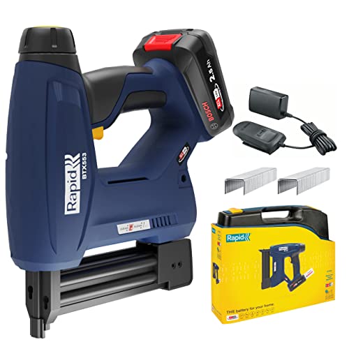 Rapid BTX553 18V P4A Batteridriven Och Sladdlös Häftpistol, För Möbelomklädning Och Hobbyarbete, Fintrådsklammer Nr. 53 och Dyckert Nr. 8, 2.5Ah-batteri, Laddare Och Fodral Ingår (5001506)