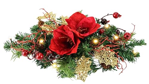 Konstgjord granhylla med röd amaryllis bärkottar LED-belysning, varmvit 43 x 10 x 20 cm, juldekoration, bordsdekoration, adventsdekoration, batteridriven för jul