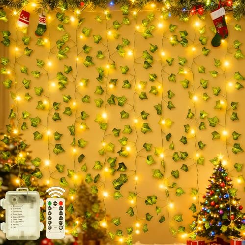 Dekorfun murgröna, ljuskedja 10 m, 100 LED, batteridriven med fjärrkontroll för rum, dekor, 8 lägen, vattentät, konstgjord murgröna, med ljusslinga för balkong, terrass, trädgård