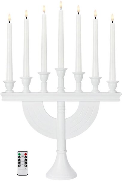 EMOS Trä LED-ljusstake i vitt, klassisk ljushållare med 7 LED-lampor, batteridriven 2 x AA, inomhus IP20, 6/18 h timerfunktion, 35 x 29 cm