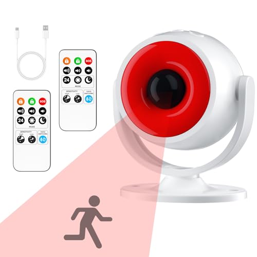 Cuteefun Rörelsedetektor med larm, 2 fjärrkontroller, 120 dB sirene, justerbar volym, 3 varningslägen, USB/batteridriven rörelsesensor, trådlös PIR-sensor för affärer, garage
