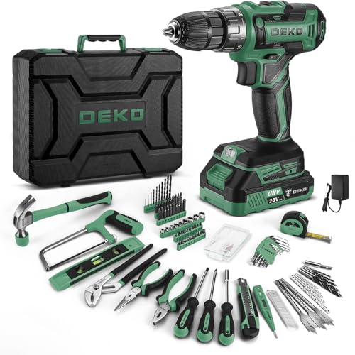 DEKO Komplett verktygslåda med elektrisk skruvmejsel/20 V batteridriven borrmaskin, 186 stycken grön väska, professionell gör-det-själv-hushållsverktygslåda för kontor och trädgård