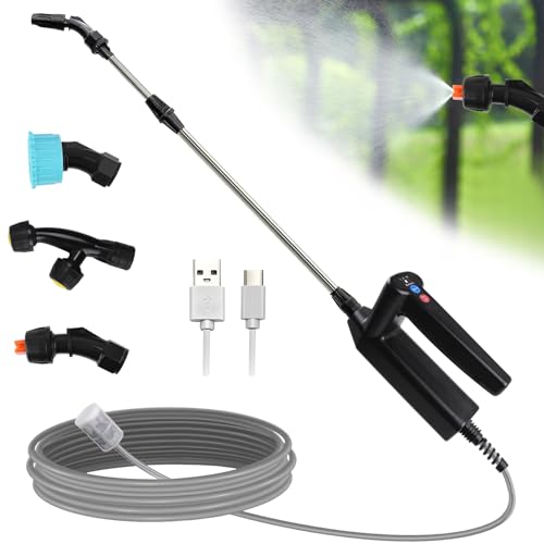 Batteridriven tryckspruta elektrisk 7,4 V, 3 sprayhastigheter 4 justerbara munstycken, 5 m slang och utdragbar sprayrör, lätt och bärbar för trädgård, växter