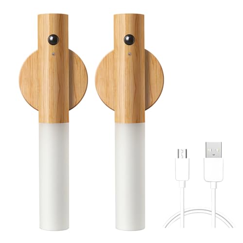 Lanmou USB-uppladdningsbar vägglampa i trä, inomhusvägglampa med rörelsedetektor, varmvita trådlösa batteridrivna vägglampor med strömbrytare, magnetisk sänglampa batteridriven, för sovrum och trappor (B)
