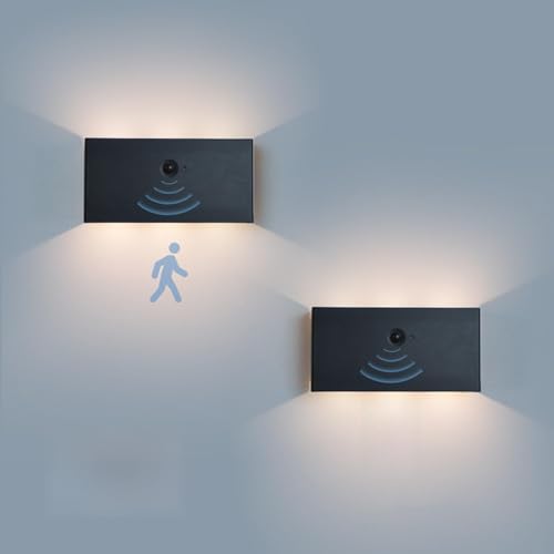 NIBSHOOM Batteridriven vägglampa inomhus med rörelsedetektor, 2 stycken vägglampa batteri justerbar strålform, 3 000 K LED vägglampa USB uppladdningsbar trådlös dimbar svart aluminium för sovrum