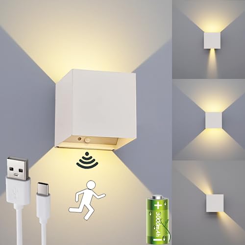 ACMHNC Vit inomhus vägglampa med rörelsedetektor batteridriven vägglampa med strömbrytare USB uppladdningsbar trådlöst varm vit halllampa, 2 200 mAh, magnetiskt nattljus, för sovrum hall trapphus