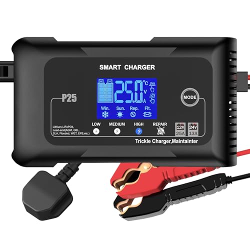 25 A bilbatteriladdare 12 V/24 V LiFePO4 batteriladdare, batteriunderhåll och batterideulfator med LCD-skärm för båt SUV motorcykel litium och blysyra (AGM, GEL, MF, EFB, SLA, etc.) batterier