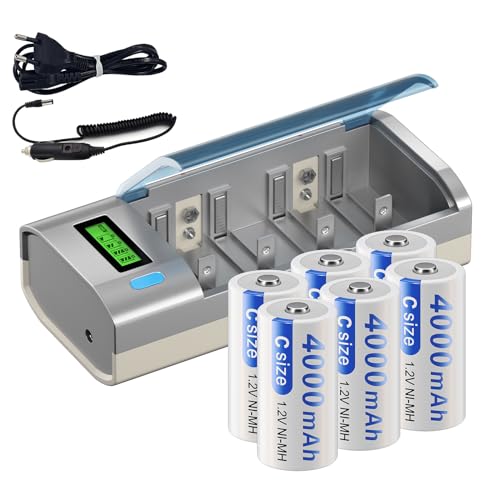 Mspalocell Baby C batteri laddningsbart med universal batteriladdare, 6 st 4000 mAh, laddningsbara C batterier med LCD batteriladdare för AA/AAA/C/D NI-MH batterier