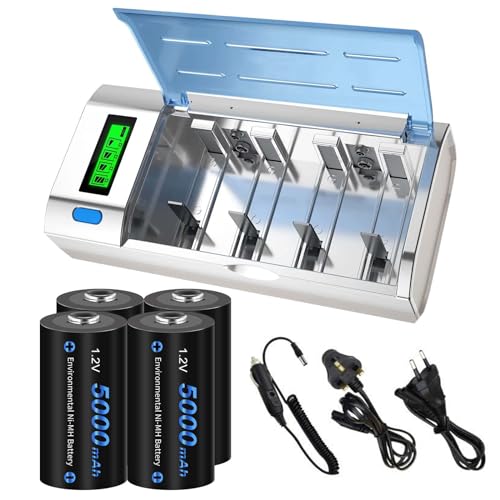 CITYORK universal LCD-display batteriladdare med urladdningsfunktion för AA, AAA, C, D, 9V NI-MH NI-CD batterier med 4 x NI-MH C storlek 5000mAh batteri