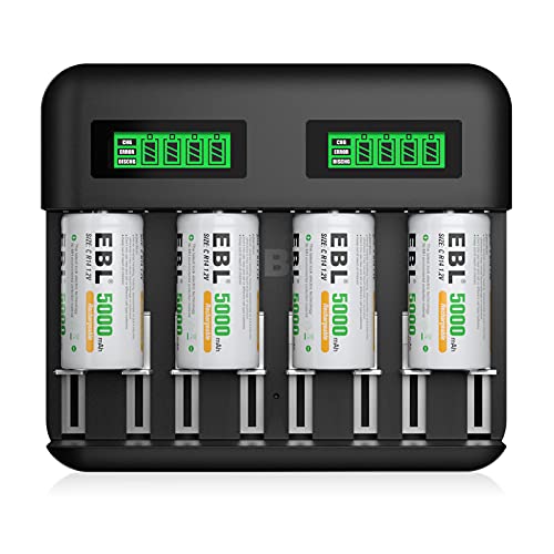 EBL batteriladdare inkl. 4 x C 5 000 mAh för AA AAA C D NI-MH batterier typ C Input snabbladdare, LCD-display batteriladdare
