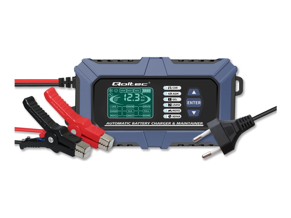 Qoltec - Batteriladdare - Lcd, Reparationsfunktion 12V, Med Batteritestare - Ac 220-240 V