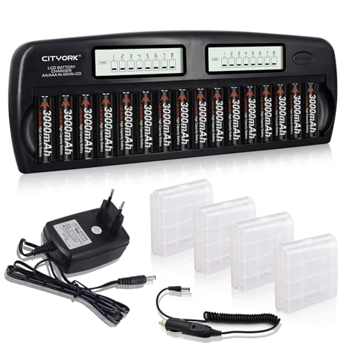 CITYORK sladdlös snabbladdare – integrerat IC-skydd med LCD-skärm – för AA AAA NI-MH-batterier, inkl. 16 x AA 3 000 mAh NiMH-batterier, batteriväska