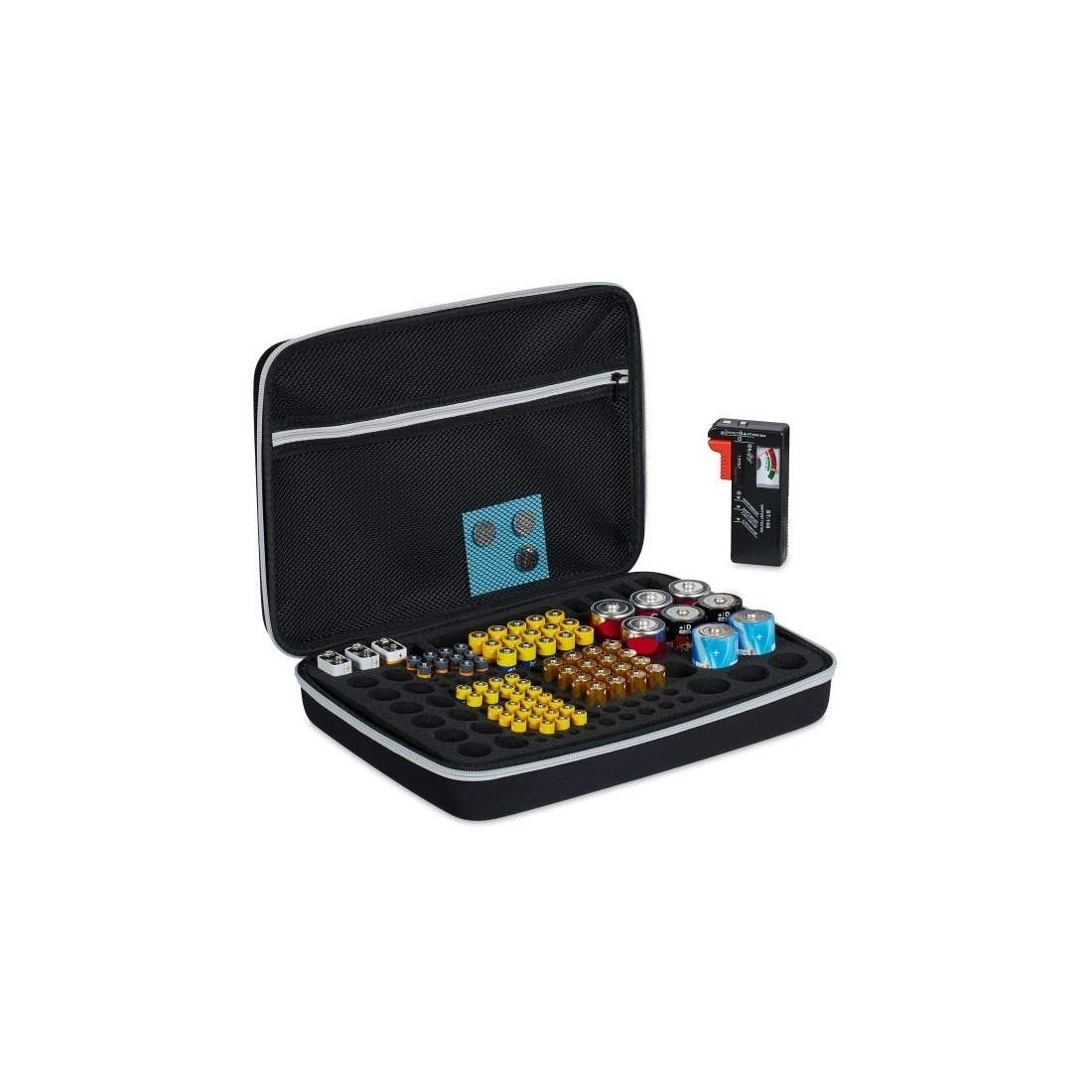 Relaxdays batteriväska med tester, för AA, AAA, C, D & 9 V blockbatteri, förvaringslåda 134 batterier, svart