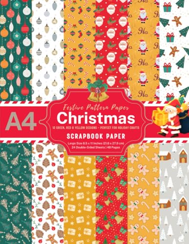 A4 Christmas Scrapbook Paper: 12 Festive Designs: Baubles, Santa, Bells, Gingerbread, Trees, and More | Red, Green, Yellow, and White Art Paper for DIY Holiday Crafts, Cards, and Decorations