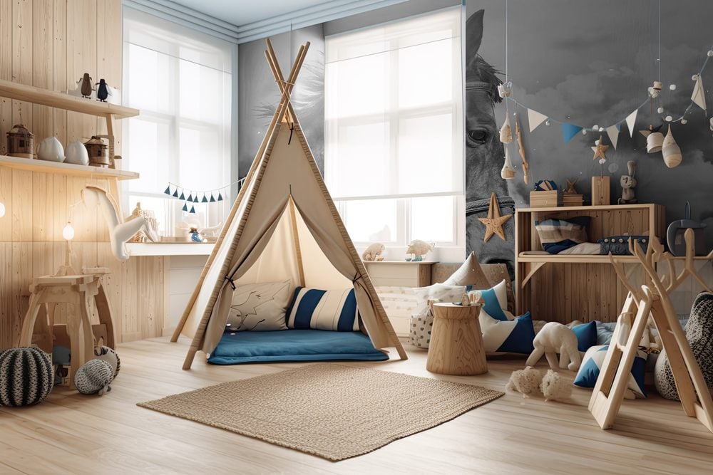 Fototapet -Bay horse on flowers meadow - Sovrum - Scandiwall - Häst