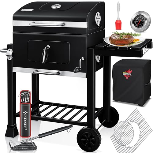 KESSER® Grillvagn XL-kolgrill med lock, hjul, handtag i rostfritt stål, grillgaller, borste, täcklock och termometer, stor BBQ-kolgrill med vagn för camping och trädgård