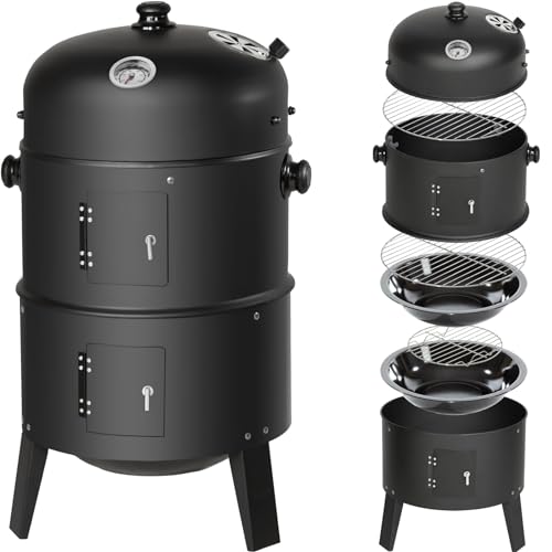tectake® 3 i 1 BBQ Smoker/Röktunna/Kolgrill med Termometer, Justerbar Luftventil, Vattenskål, Förkromat Grillgaller, Kolskål med Askgaller, 2 Sidoluckor för Ventilation, Bärhandtag