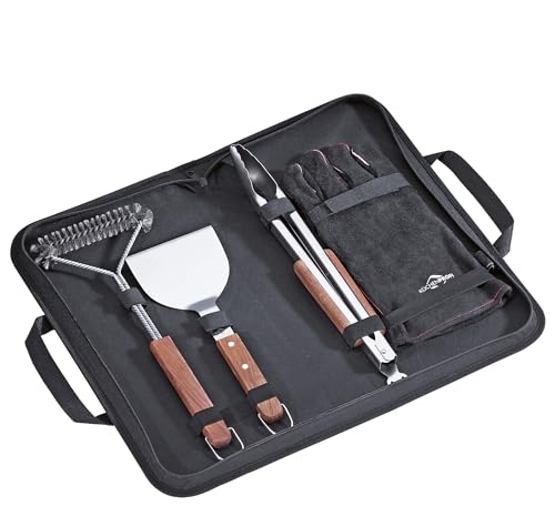 Köksprofi BBQ-set Texas, 4 delar, rostfritt stål, grillbesticksset, handske, grilltänger med flasköppnare, hamburgar-galler, grillborste, med trähandtag, i svart nylonväska