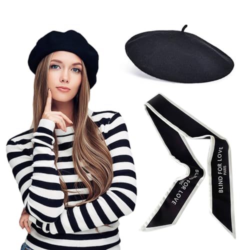 1 st fransk basker med 1 sidenscarf, beanie-mössa för kvinnor, retro vintermössa, mjuk och lätt, modeaccessoar smycke, lämplig för möten med vänner, festdekoration (svart), svart, M