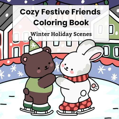 Cozy Festive Friends Coloring Book: Festive Winter Holiday Scenes with Bears, Rabbits & Cats, Easy Kawaii Coloring Pages for Kids Ages 6-12