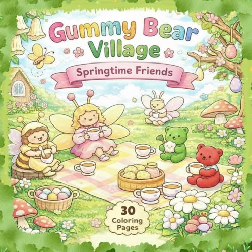 Gummy Bear Village: Springtime Friends: Cute & Cozy Coloring Book for Adults and Kids | 30 Adorable Spring Scenes with Gummy Bears, Insects & Village Life
