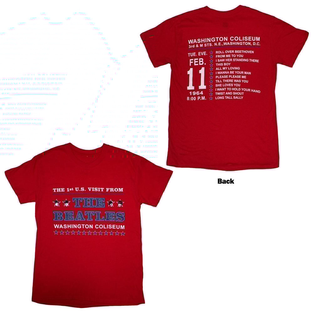 The Beatles: Unisex T-Shirt/Washington '64 Stars Setlist (Red) (Back Print) (Medium)