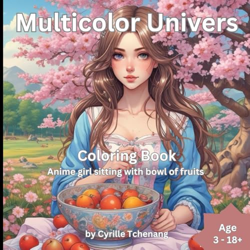 Anime girl sitting with bowl of fruit with large expressive eyes, beautiful long hair, wearing a cute dress with ribbons - Multicolor Univers