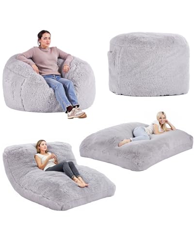 VEVOR Sittsäcksäng som kan omvandlas från sittsäck till madrass, sängfåtölj (1220 x 1220 x 762 mm) med tvättbart överdrag för vuxna, fylld med fluffig plysch, grå (Queen size)
