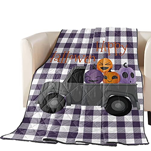 Cartoon Black Truck Söt Pumpkins Reversible Down Alternative Comforter Quilted, Lightweight Soft Bedspread for Kids Adults Woman Teen Bed, Purple White Tartan Plaid Throw Blankets for Sofa Decor