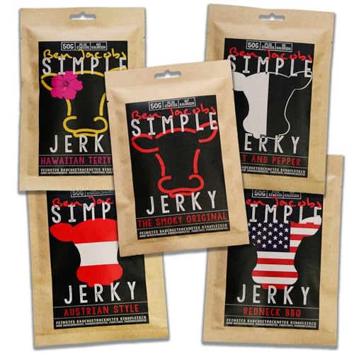 Enkel provbox Beef Jerky, 5 x 50g, Österrikes nummer 1 Beef Jerky, inga tillsatser, inga konserveringsmedel (Mixed Flavors).