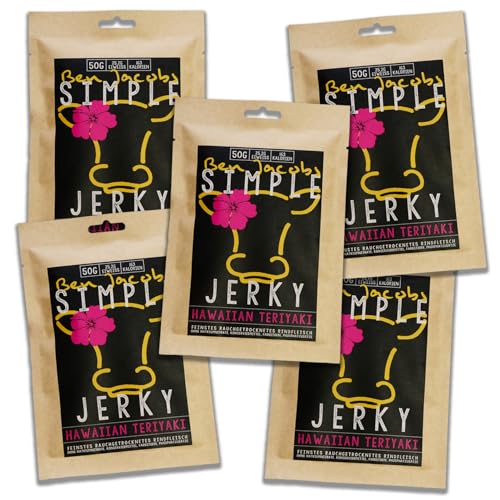 Enkel provbox Beef Jerky, 5 x 50g, Hawaiian Teriyaki, Premium Gräsmatat Österrikiskt Nötkött, inga tillsatser, inga konserveringsmedel (Hawaiian Teriyaki).