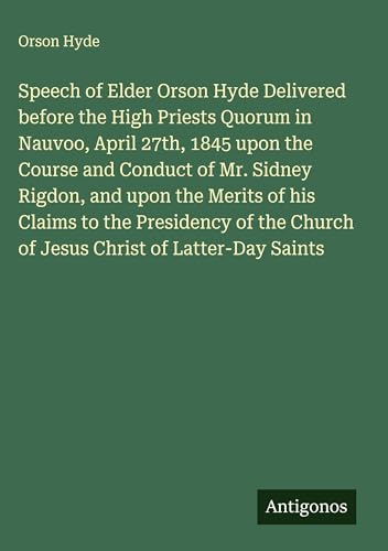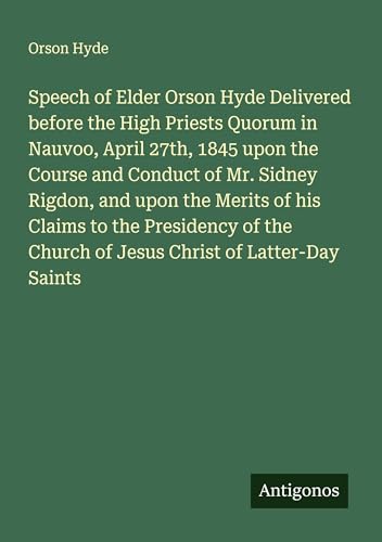 Speech of Elder Orson Hyde Delivered before the High Priests Quorum in Nauvoo, April 27th, 1845 upon the Course and Conduct of Mr. Sidney Rigdon, and ... Church of Jesus Christ of Latter-Day Saints