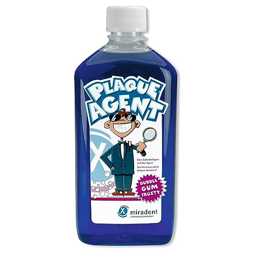 miradent Plaque Agent® tandsköljningslösning 500 ml | för plackkontroll för barn | med behaglig "Bubble Gum" smak | klar att användas inkl. doseringslock | erytrosinfri | utan alkohol
