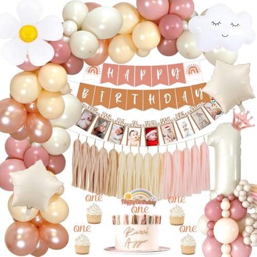 Dekorationer för 1-års-flickors födelsedag, 12 månaders födelsedagsdekoration med fotodörr, ballonger med nummer 1 och 1 år, fester och dekorationer