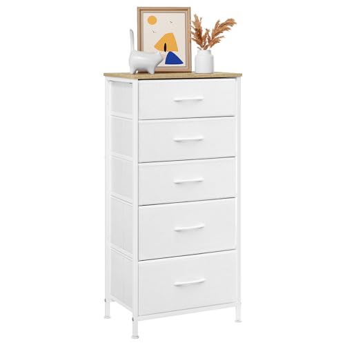 WOLTU Byrå Sovrum Tyg, Byrå med 5 lådor, Skåp med lådor för Hall, Barnrum, Vardagsrum, Molnvit + Beige Ek