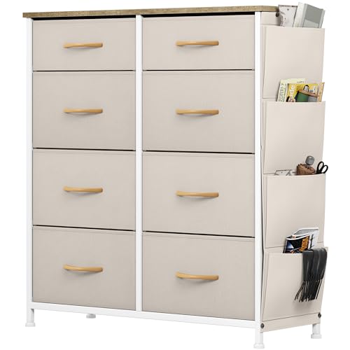 YITAHOME Byrå med sidofickor och krokar, tyg 8 lådor med handtag, metallram, trätopp, för sovrum, vardagsrum, hall, beige